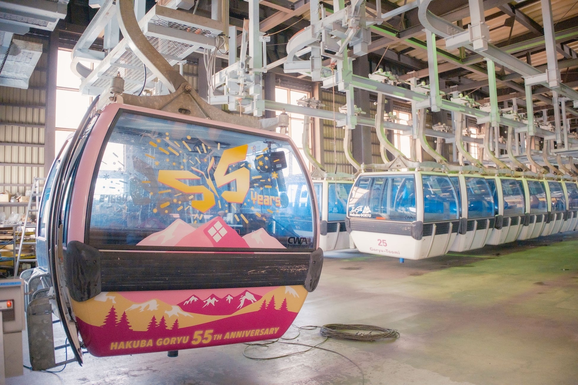 今年で創業55周年を迎える記念に、「55番」のゴンドラを特別ラッピングいたしました!ゴンドラの搬器は全部で82台あるため、乗れるかどうかは運次第のラッキーゴンドラです。ゴンドラ内には、秘密のサービスもご用意しています。
