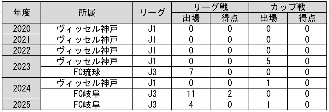 つつじが丘ファミリーサッカー部 – ヴィッセル神戸U-15 – ヴィッセル神戸U-18 – ヴィッセル神戸 – FC琉球 – ヴィッセル神戸 – FC岐阜 – ヴィッセル神戸