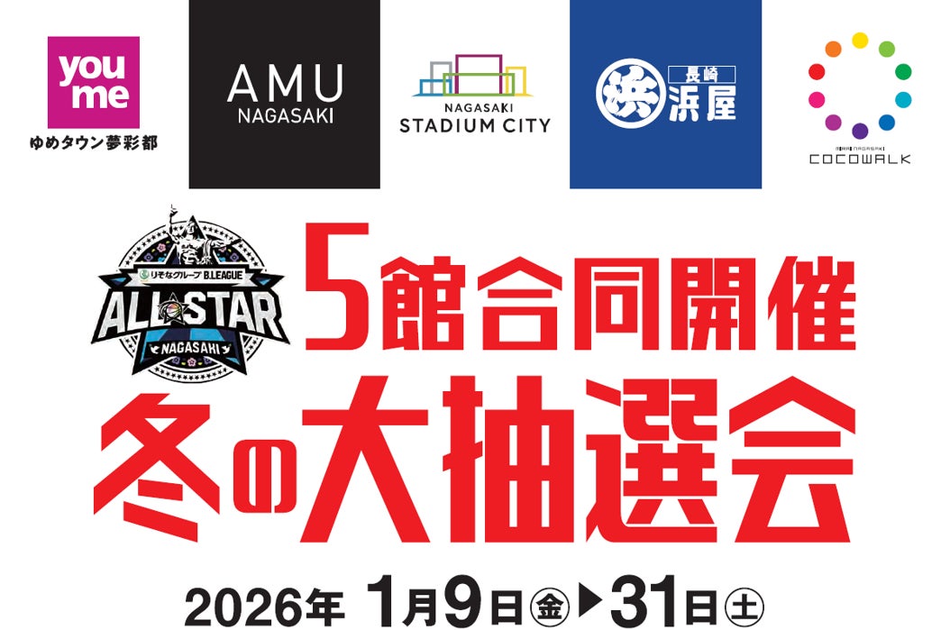 長崎市内の5つの商業施設、アミュプラザ長崎、長崎スタジアムシティ、浜屋百貨店、みらい長崎ココウォーク、ゆめタウン夢彩都(※50音順)が連携し、2026年1月9日(金)~1月31日(土)までの23日間、長崎市内における商業活性化および回遊性の向上を目的とし、市内主要5施設による合同開催『冬の大抽選会』を実施いたします。