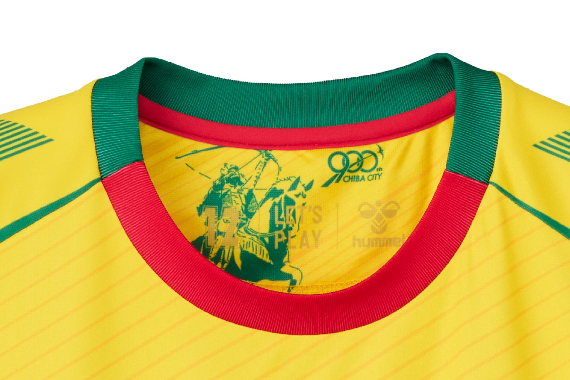 さらに、襟内側(背当て)部分にも千葉開府900年ロゴと千葉常胤彫像を配置。サポーターの番号を意味する「12番」を合わせて入れることで、ホームタウンと共に成長する想いを込めました。右袖のホームタウン表示は千葉氏が使っていた薬箱(千葉市立郷土博物館展示)を参考にして再現。各パーツに千葉市との深い結びつきとホームタウンへのリスペクトを示し、千葉開府900年を祝したユニフォームになりました。