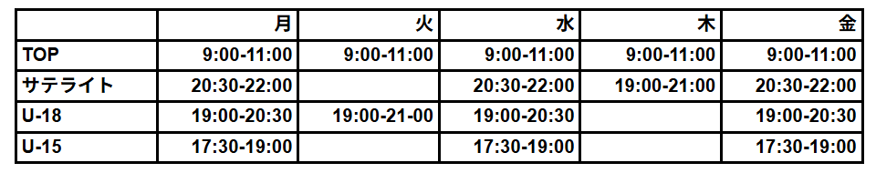 ※トレーニング場所・曜日・時間に関しましては変更となる場合がございます。