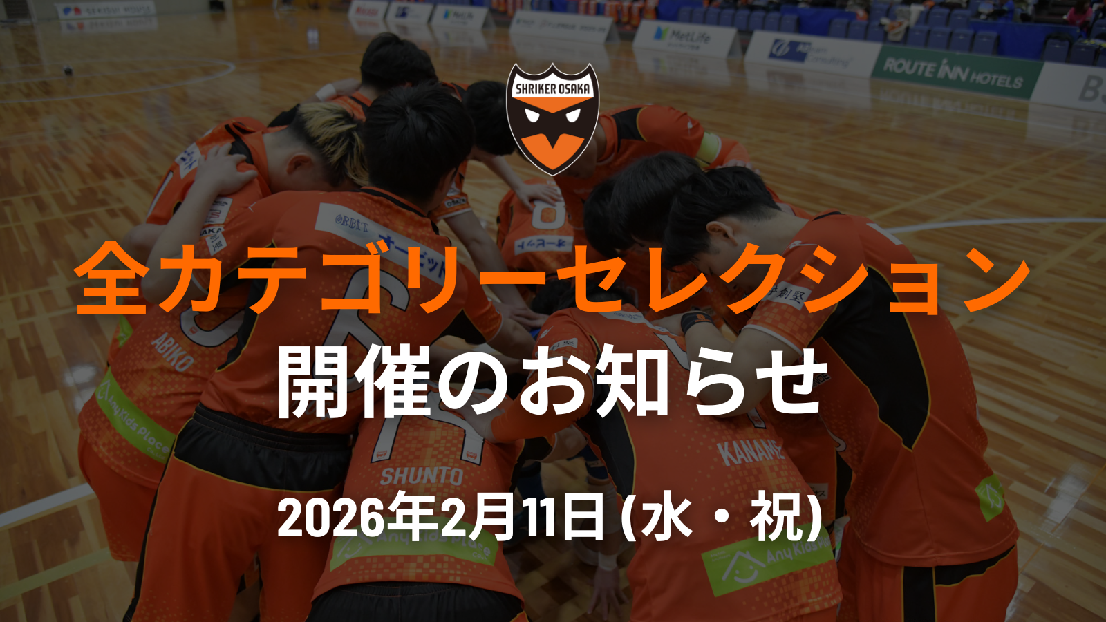 いつもシュライカー大阪を応援いただきありがとうございます。この度、2026-27シーズンに向けて、TOPチーム/サテライト/U-18/U-15の4カテゴリーを対象としたセレクションを開催いたします。