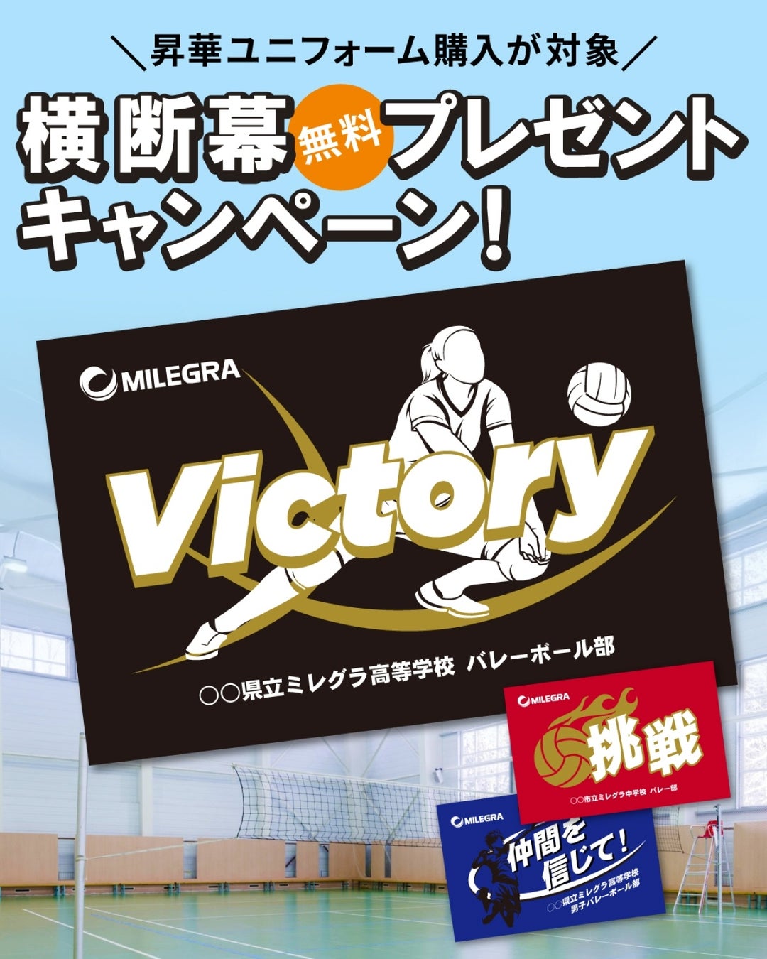 スポーツブランドの運営を中心に多彩な事業を展開している株式会社フラスコ100cc(本社:東京都台東区、代表取締役:矢口 貴士)が運営しているバレーボールウェアブランド「MILEGRA(ミレグラ)」は、2026年1月14日(水)、「昇華ユニフォーム」の購入者を対象に、横断幕プレゼントキャンペーンを開始いたしました。