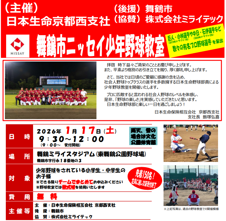 2026年1月17日、舞鶴ミライスタジアムにおいて、日本生命野球部の選手・コーチ7名による小学生対象の「ニッセイ野球教室」が開催されます。