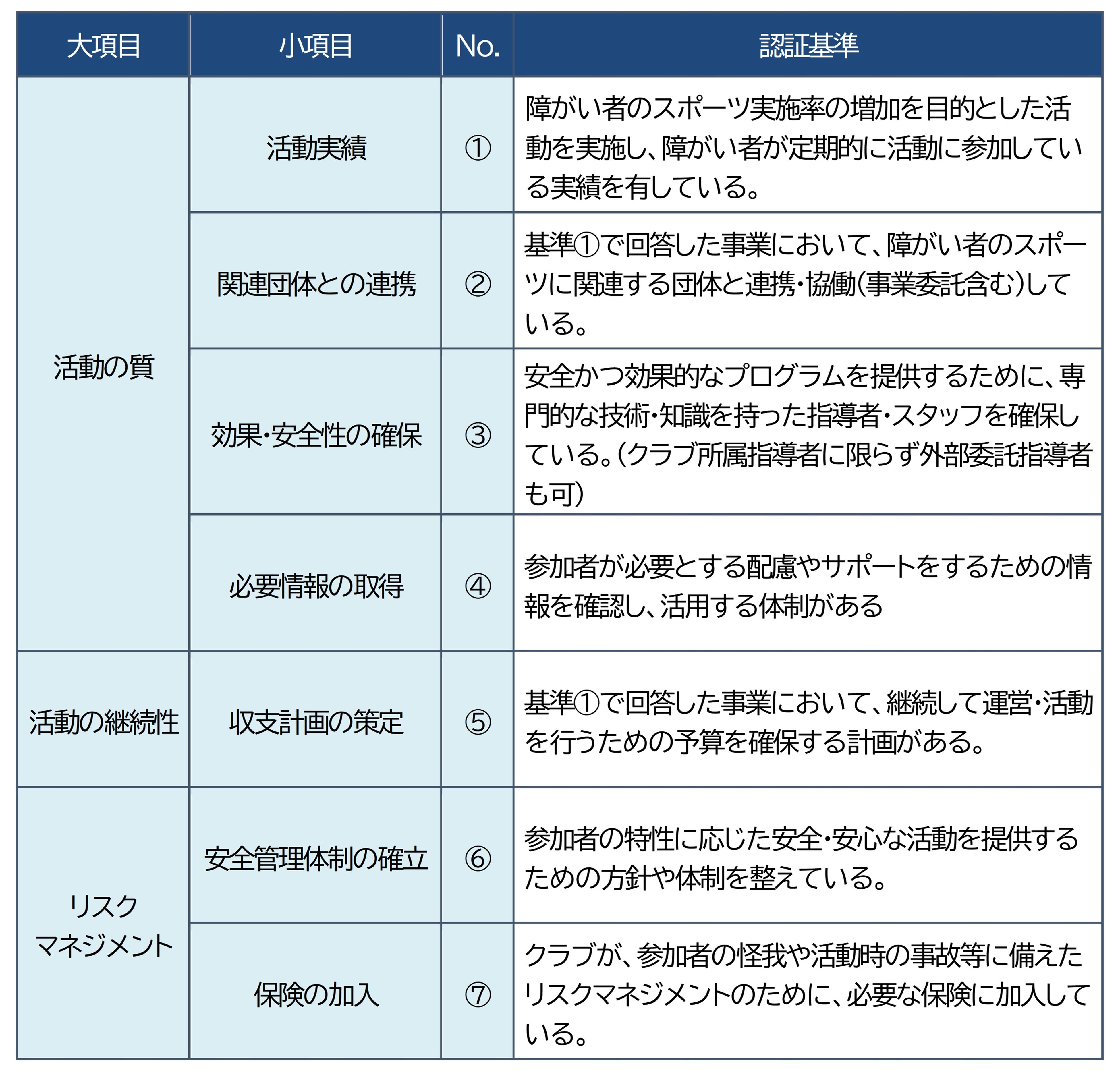障がい者スポーツ推進タイプの基準は、下記の7つの項目からなる基準を設けています。