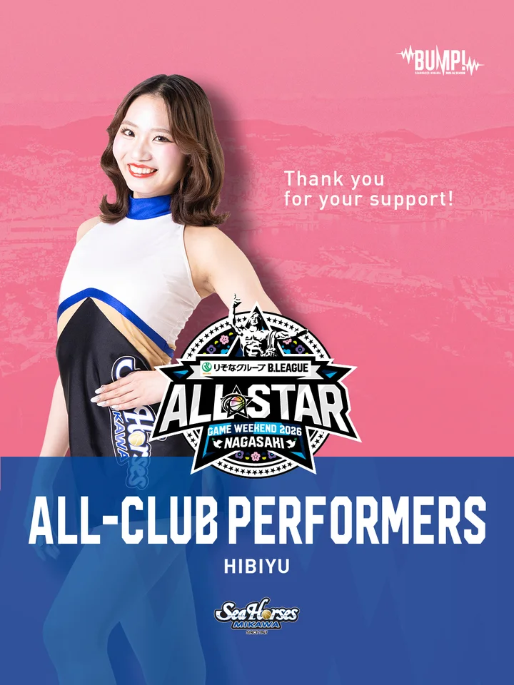 2026年1月16日(金),17(土),18(日)に開催される「りそなグループ B.LEAGUE ALL-STAR GAME WEEKEND 2026 IN NAGASAKI」MASCOTS&PERFORMERS決定選出のお知らせにおいて、各チームから選ばれる『ALL-STAR MASCOTS』にシーホースくん、『All-CLUB PERFORMERS』に、Super GirlsのHIBIYUが選出されました!