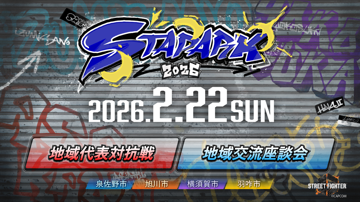 このたび、2026年2月22日(日)に、大阪府泉佐野市をはじめとする4つの自治体が連携をとり、大人気ゲームタイトル「STREET FIGHTER 6(ストリートファイター6)」を使用したeスポーツイベント「スタパーク2026」を開催いたします。