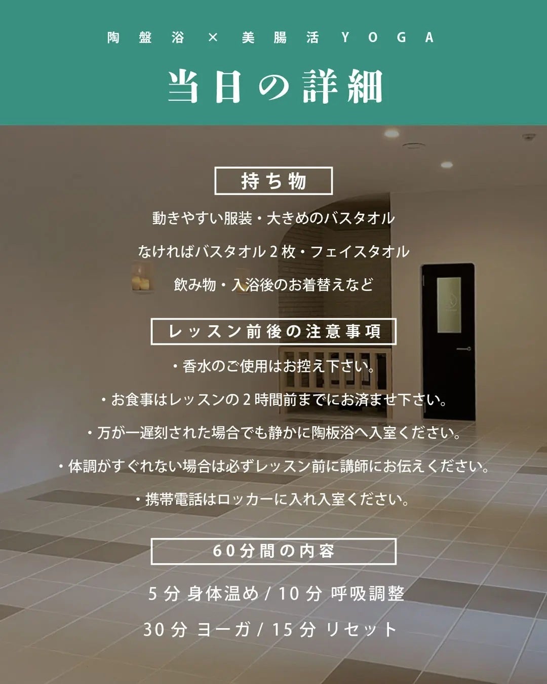 冷えやすい冬こそ、体を“動かす前に温める”ことが大切。本イベントでは、陶盤浴で体の芯から温まりながら行うヨガを通して、腸内環境・巡り・呼吸をやさしく整えていきます。
