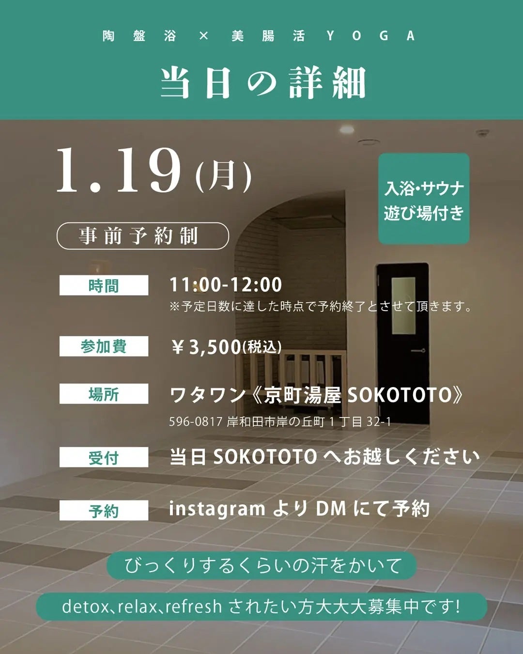 大阪・岸和田のエンターテインメントモール WHATAWON(ワタワン) にて、冬の体調管理に特化した特別レッスン「陶盤浴 × 美腸活YOGA」 を2026年1月19日(月)に開催します。