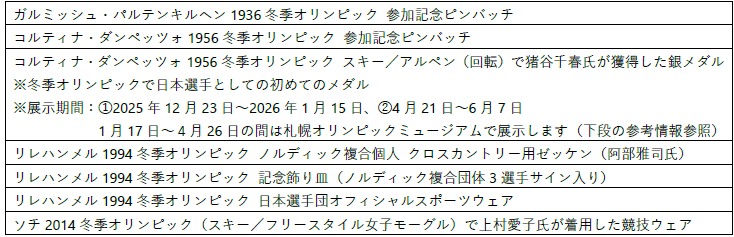 また、再開同日からは、今年度の企画展示として、公益財団法人日本オリンピック委員会、公益財団法人日本パラスポーツ協会日本パラリンピック委員会との共催で、ミラノ・コルティナ2026冬季大会に関する特別展示会を開催いたします。展示会では、大会に出場するTEAM JAPAN(日本代表選手団)の活躍や新規採用競技の紹介に加え、コルティナ・ダンペッツォ1956冬季大会にもスポットを当て、その歴史や当時の日本人選手の活躍を振り返ります。大会終了後には出場選手の大会使用アイテムなど、臨時展示物の追加・入替を行う予定です。