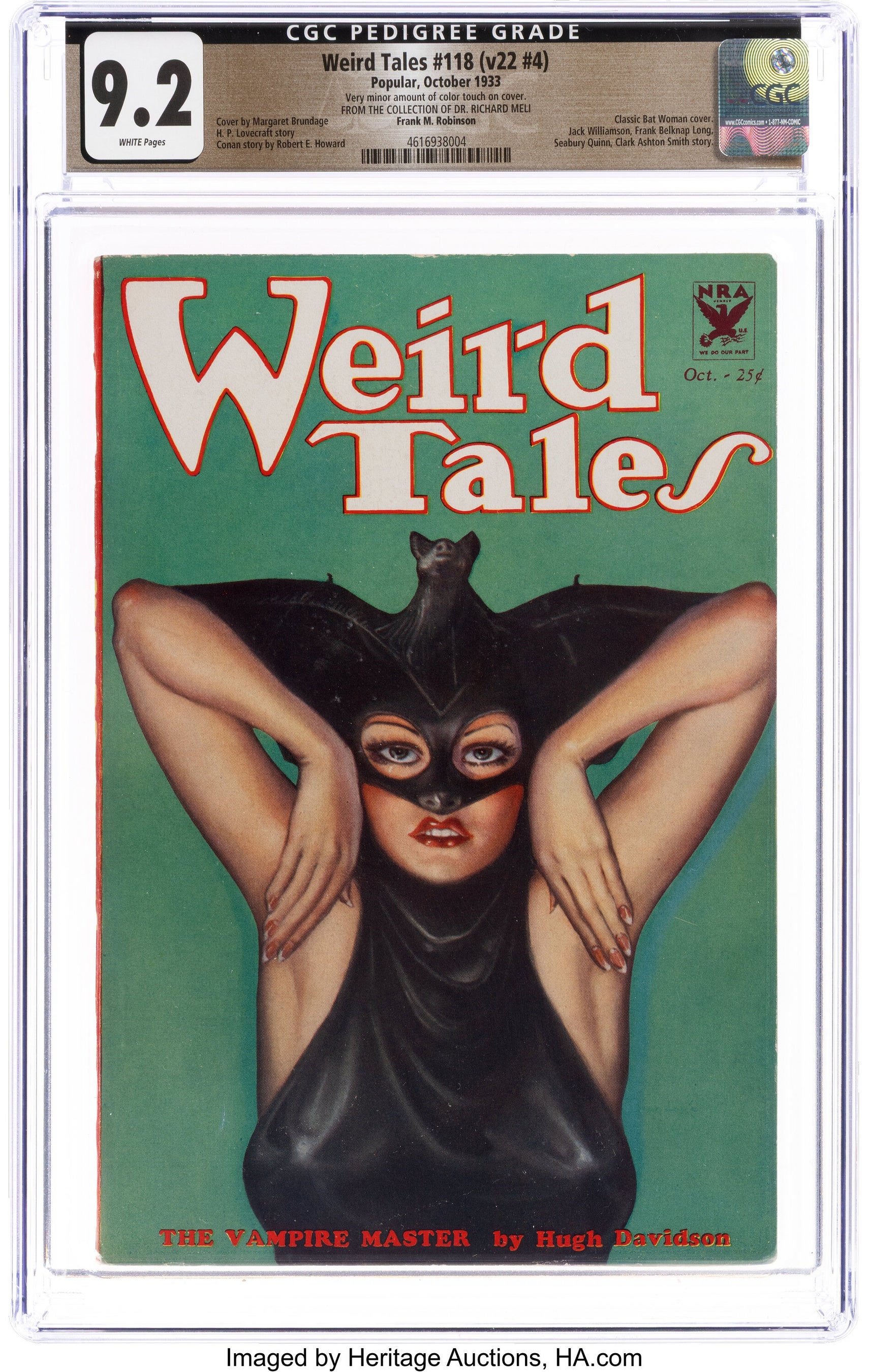 12月には、初開催となる Pulps Signature® オークションが実施され、総売上184万ドル(約 2億8,990万円)を記録しました。コレクターのリチャード・メリー博士のコレクションを中心に構成された本オークションでは、1935年6月創刊号『Spicy Mystery Stories』が15万6,000ドル(約2,450万円)で落札されたほか、“バット・ウーマン”表紙で知られる『Weird Tales』第118号が10万5,000ドル(約1,650万円)で落札され、見過ごされてきた分野に新たな市場価値を確立しました。