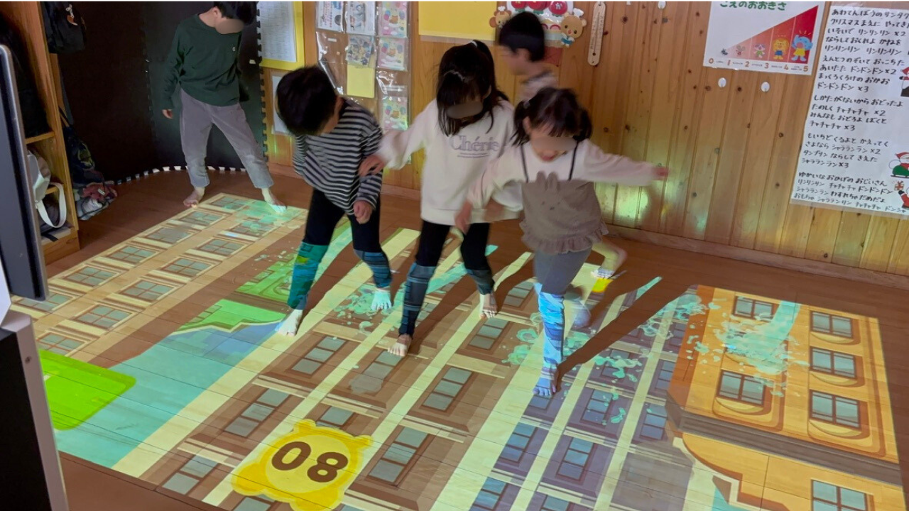 プロジェクター・センサー・PCを一体化したシステムにより、床に投影される映像に合わせて「踏む」「跳ぶ」「避ける」「追いかける」といった直感的な身体動作を促します。