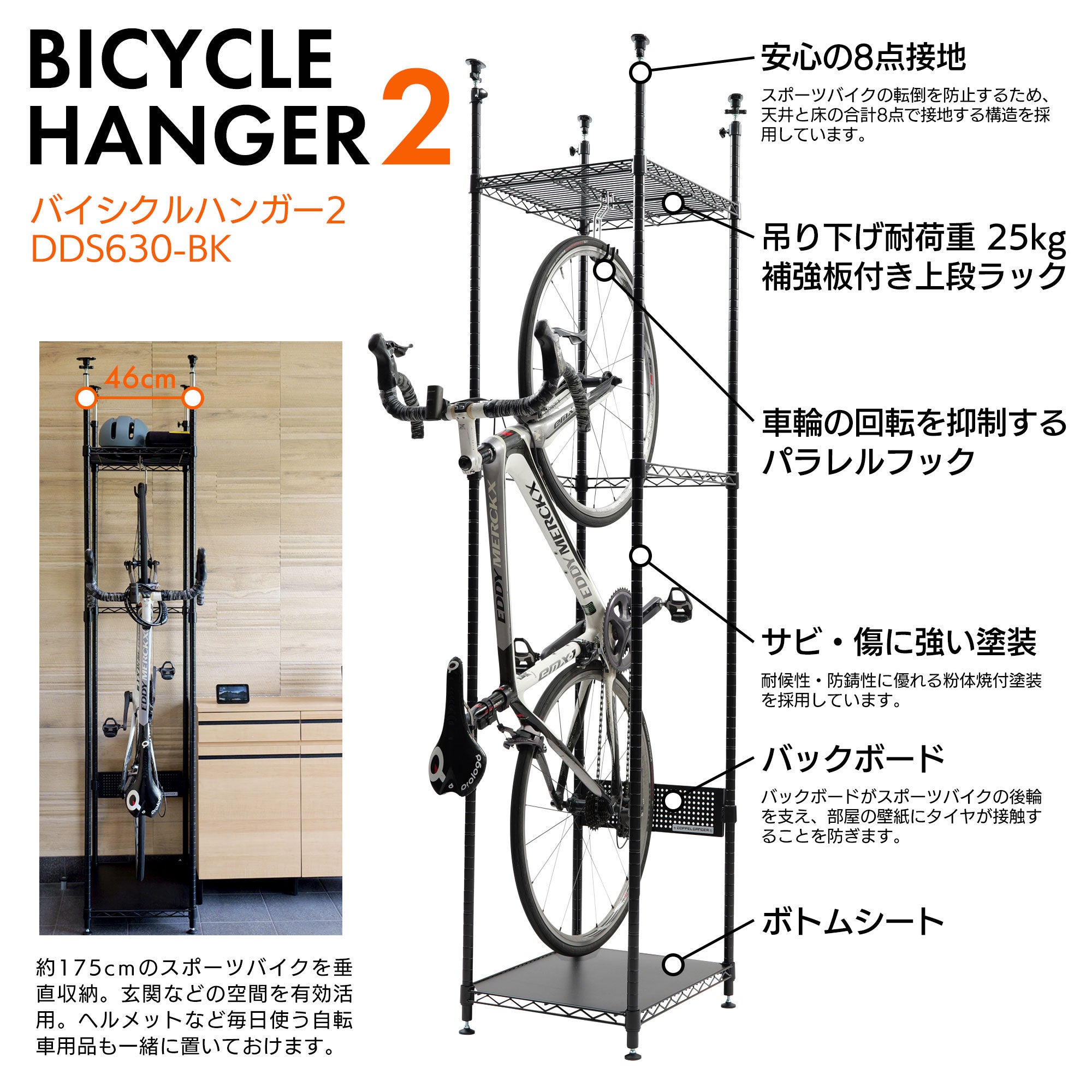 「DDS630-BK」は、縦方向の空間を活かして自転車とギアをまとめて収納できるラックです。