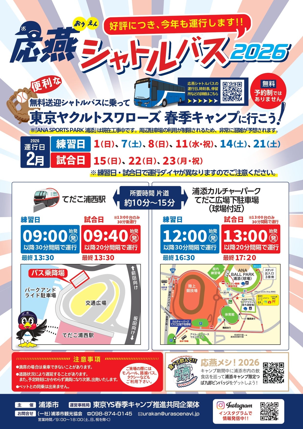 それに合わせ浦添市観光協会は、来場者の利便性向上と地域活性化を目的とした『応燕(おうえん)キャンペーン』を実施します。深刻な駐車場不足を解消する無料シャトルバスの運行に加え、市内3エリアの飲食店を巡り限定ピンバッジがもらえる『応燕メシ!』、宿泊者に公式戦チケットを贈呈する『応燕ステイ!』など、ファン必見の施策を展開。スポーツを通じた地域振興を加速させます。