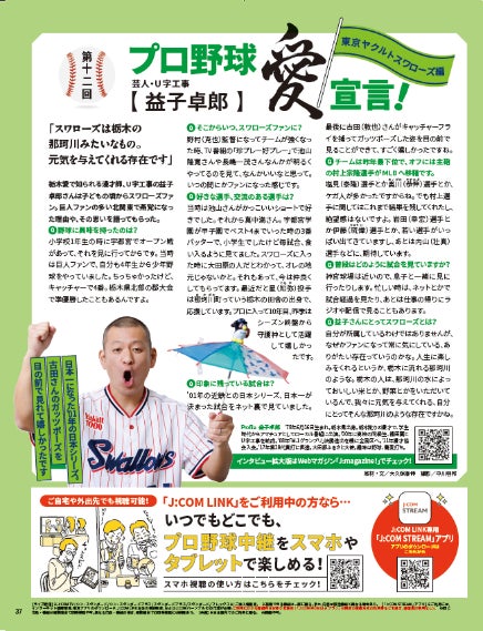 連載「プロ野球“愛”宣言!」は、J:COMご加入者さま向け番組ガイド誌「ジェイコム マガジン」ならびに“エンタメをもっと楽しむWebマガジン”「J:magazine!」(読み:ジェイマガジン)で毎月日本全国のプロ野球ファンにお届けしています。著名人の球団ファンになったきっかけや、ご自身の“リアル”な「プロ野球の応援&観戦スタイル」を語ります。第12回は、「2001年の近鉄との日本シリーズで、日本一になった瞬間をバックネット裏で見ていた」益子卓郎さんの深すぎる“スワローズ愛”をお楽しみいただけます。