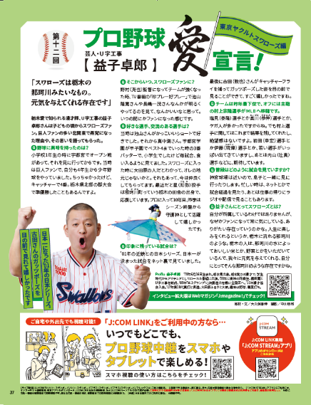 連載「プロ野球“愛”宣言!」は、J:COMご加入者さま向け番組ガイド誌「ジェイコム マガジン」ならびに“エンタメをもっと楽しむWebマガジン”「J:magazine!」(読み:ジェイマガジン)で毎月日本全国のプロ野球ファンにお届けしています。著名人の球団ファンになったきっかけや、ご自身の“リアル”な「プロ野球の応援&観戦スタイル」を語ります。第12回は、「2001年の近鉄との日本シリーズで、日本一になった瞬間をバックネット裏で見ていた」益子卓郎さんの深すぎる“スワローズ愛”をお楽しみいただけます。