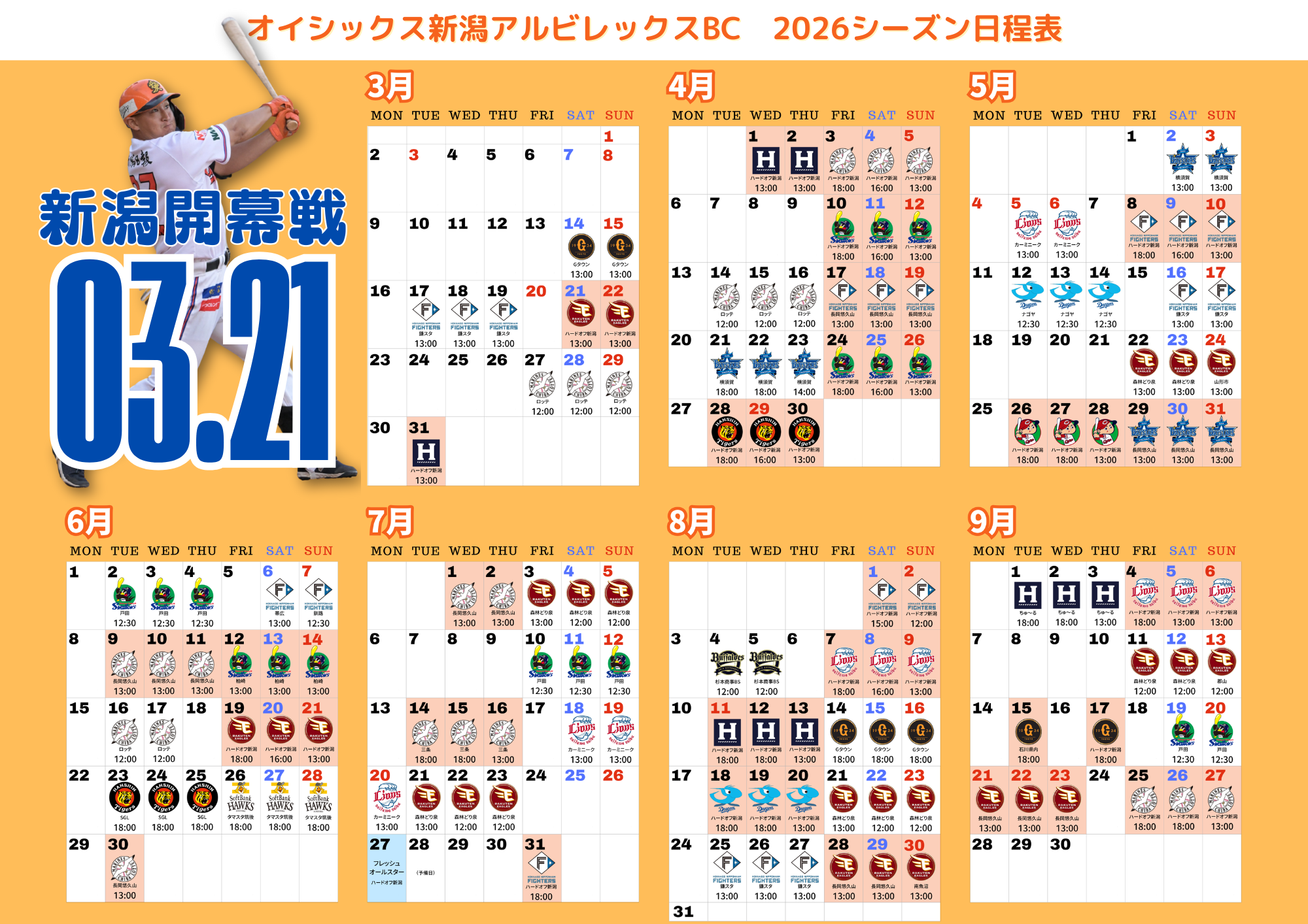 新潟でのホーム開幕戦は、3月21日(土)にHARD OFF ECOスタジアム新潟での東北楽天ゴールデンイーグルス戦に決まりました。