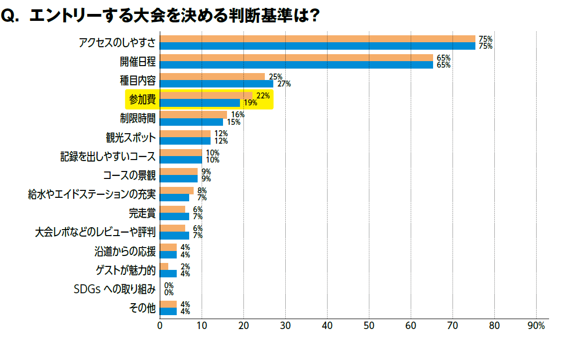 大会選びの基準を問う設問では「アクセス」と「開催日程」が前年に続いてツートップ。「参加費」は前年より3ポイント、一昨年からは6ポイント減少しました。コロナ後は大会参加費の上昇が話題となっていましたが、大会選びにおける参加費の比重は徐々に下がりつつあるといえるかもしれません。