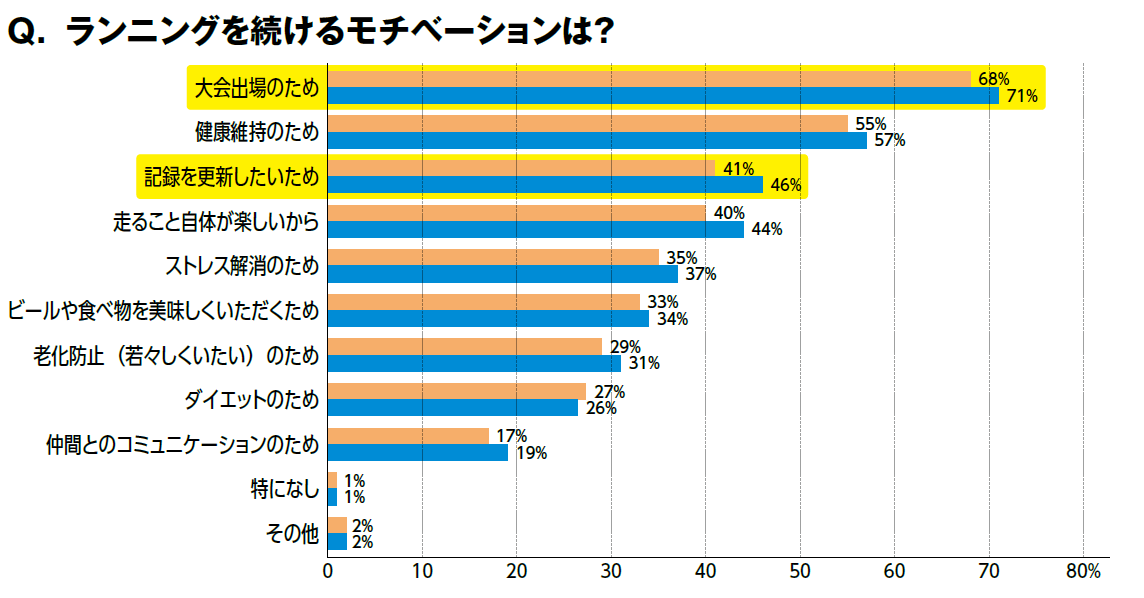ランニングを続けるモチベーションを問う設問では「大会出場のため」が前年より3ポイント増加して71%、「記録を更新したいため」が前年より5ポイント増加して46%となり、両項目ともコロナ前の2018年(62%、44%)を上回る結果となっています。特に記録更新への意欲は一昨年から8ポイント増加。大会に出場する意欲の高まりとともに、トレーニングの成果を発揮し、自己ベストを更新したいというモチベーションが前年より顕著に表れています。