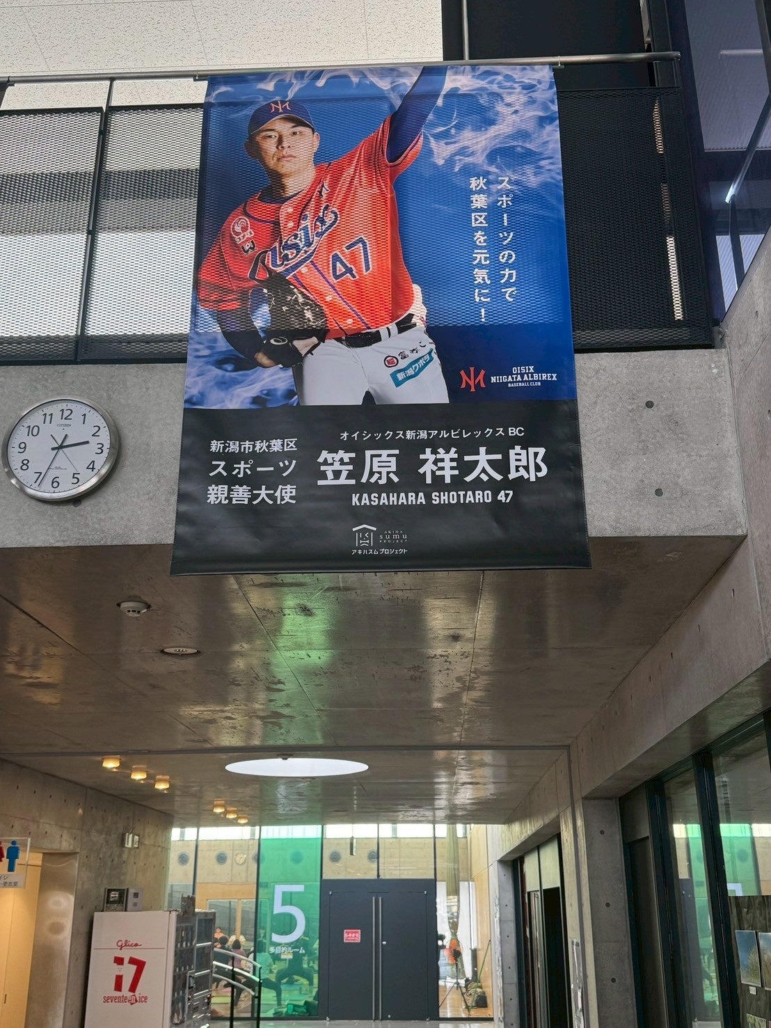 また、本就任を機に、秋葉区総合体育館(新潟県新潟市秋葉区程島2009)にて、笠原選手の2mサイズの特大バナーの掲示がスタートしました。