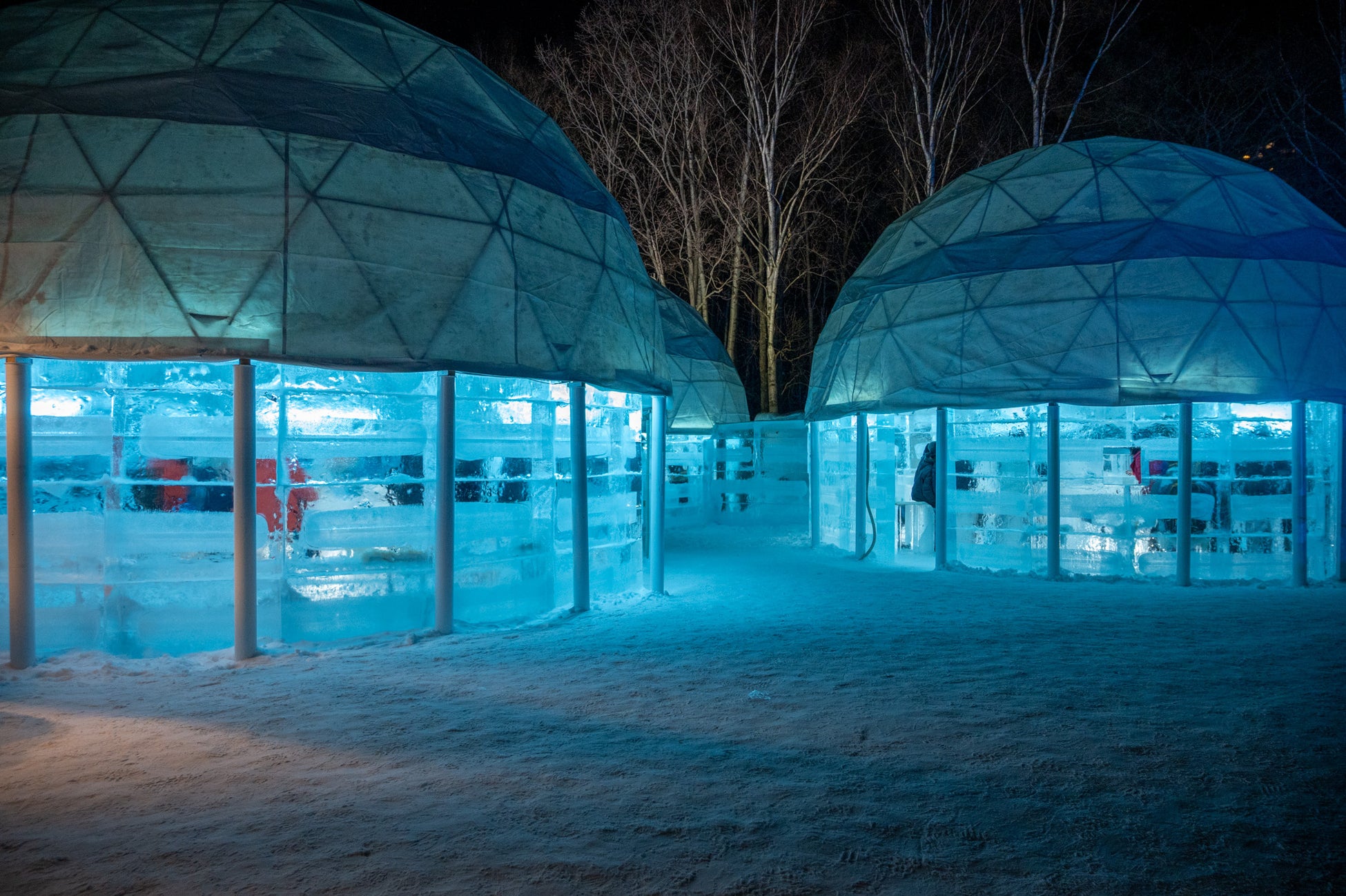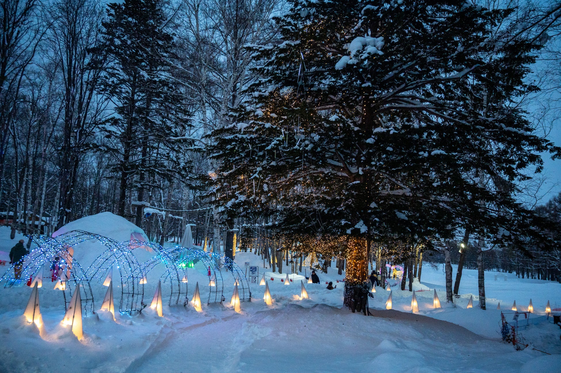 その後トマムへ向かい、夜は幻想的なアイスヴィレッジを楽しみ、「木林の湯」で非日常を味わう。