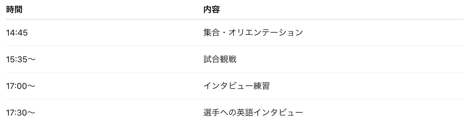 参加する子どもたちは、試合を観戦した後、海外出身選手に英語で1問インタビューを行います。
