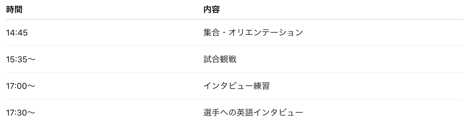 参加する子どもたちは、試合を観戦した後、海外出身選手に英語で1問インタビューを行います。