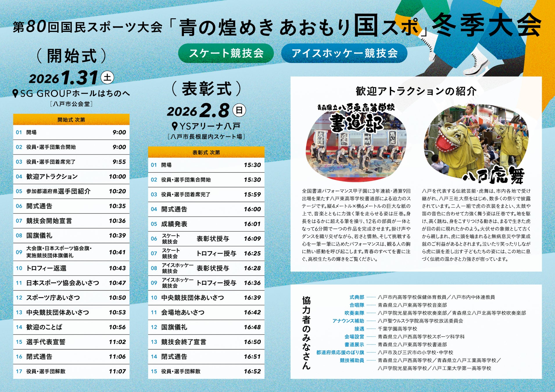 冬季大会と本大会が同じ県で開催される史上初の「完全国スポ」が、青森県八戸市での開始式を皮切りに始まります。令和7年12月8日の青森県東方沖地震による被害を乗り越え予定どおりの開催が決定。昭和22年の第1回大会よりスケート競技が行われている八戸市は、「氷都八戸」の愛称でも親しまれています。