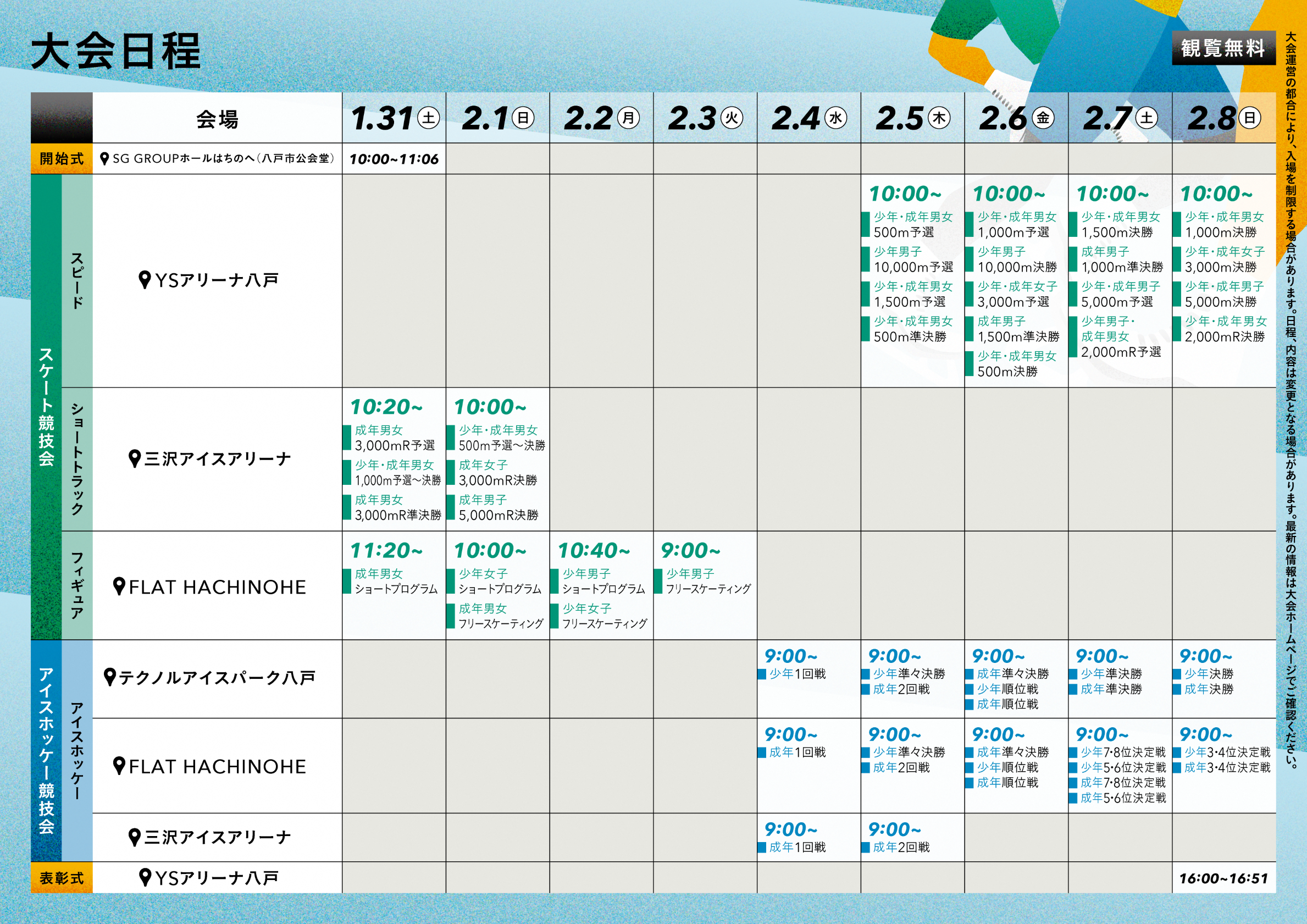 第1回大会でスケート競技が開催された青森県八戸市は、学校の体育でスケート教室が実施されるなど、冬季競技が盛んなことから「氷都八戸」の愛称でも呼ばれています。