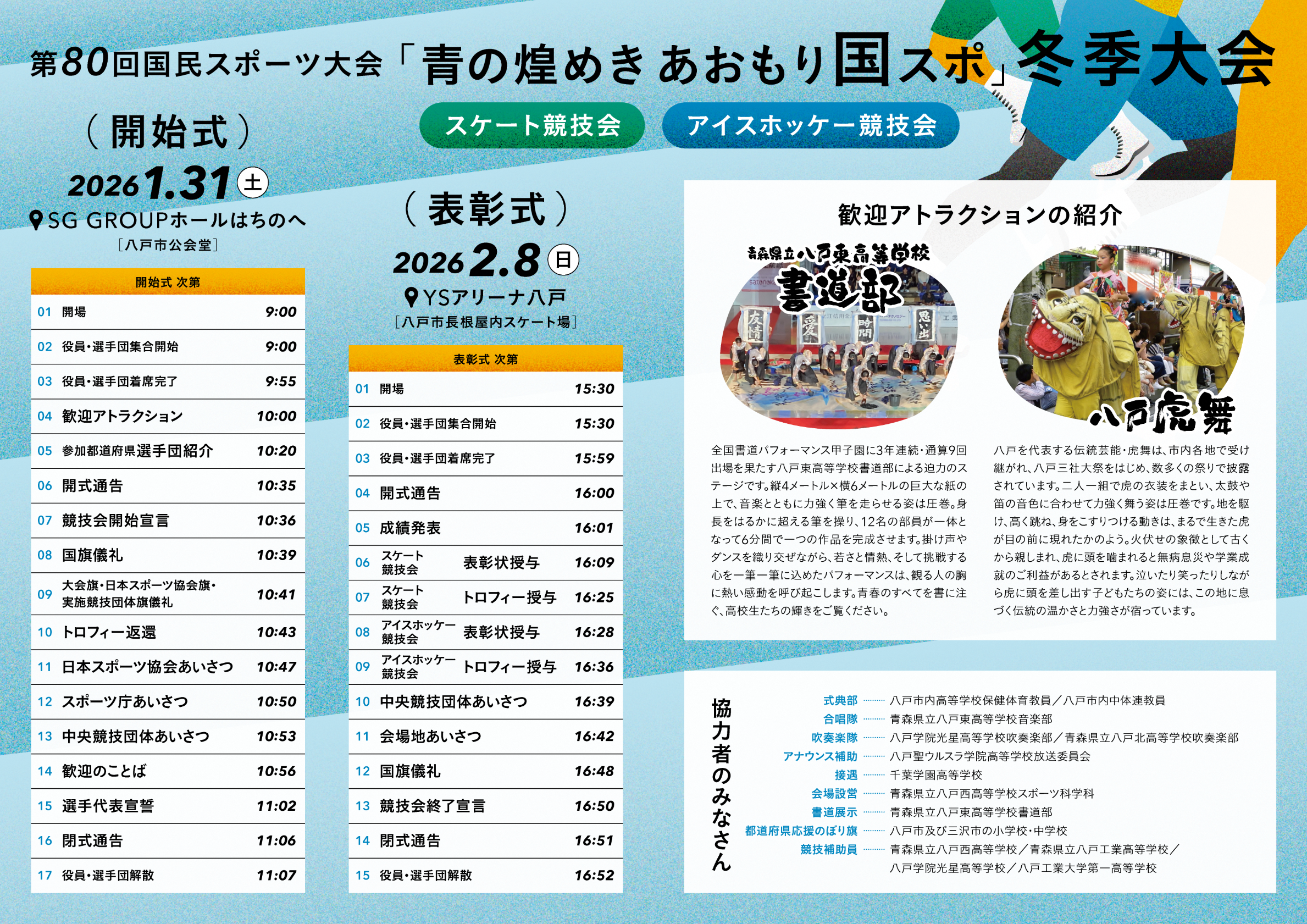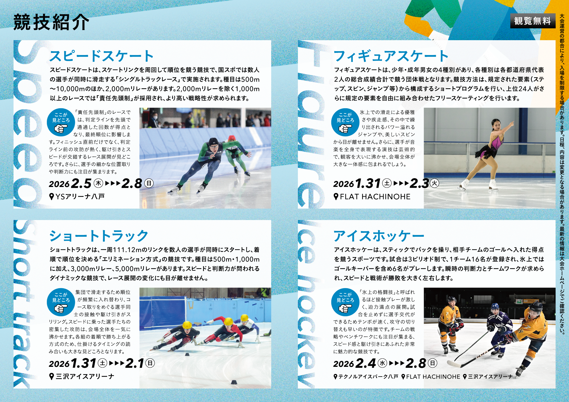 冬季大会と本大会が同じ県で開催される史上初の「完全国スポ」が、青森県八戸市での開始式を皮切りに始まります。令和7年12月8日の青森県東方沖地震による被害を乗り越え予定どおりの開催が決定。昭和22年の第1回大会よりスケート競技が行われている八戸市は、「氷都八戸」の愛称でも親しまれています。