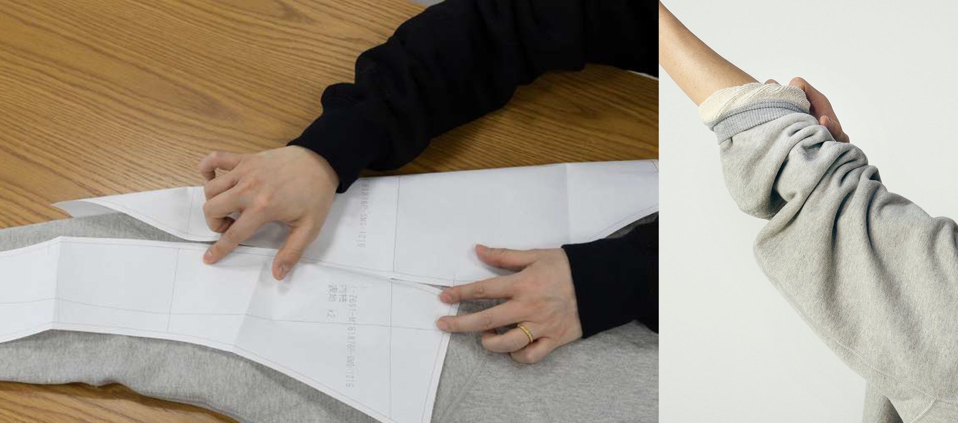 立体的なパターンで構成されているのでカーブする線が多く、オートメーションの縫製では難しく、長さもカーブの具合も微妙に違うライン同士を縫い合わせるには職人が一方の生地を微妙な手加減で調整しながら縫わないときれいに仕上がりません。また、「フラットシーマ」という縫製方法によって、縫い代がフラットになり、肌当たりを良くしています。熟練の職人が服の構造を理解しながらミシンをかけることで初めて「KOBE TERRY」のスウェットは完成します。