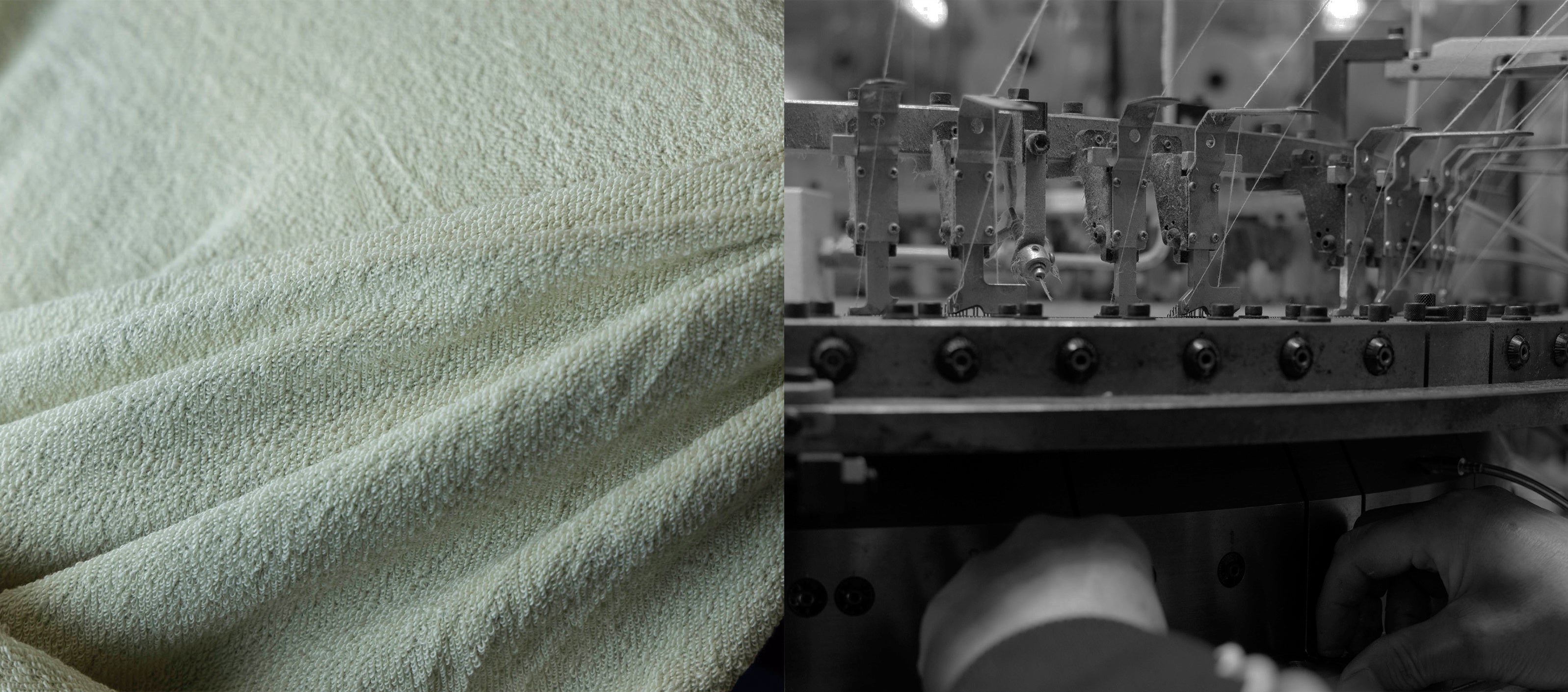 立体的なパターンで構成されているのでカーブする線が多く、オートメーションの縫製では難しく、長さもカーブの具合も微妙に違うライン同士を縫い合わせるには職人が一方の生地を微妙な手加減で調整しながら縫わないときれいに仕上がりません。また、「フラットシーマ」という縫製方法によって、縫い代がフラットになり、肌当たりを良くしています。熟練の職人が服の構造を理解しながらミシンをかけることで初めて「KOBE TERRY」のスウェットは完成します。