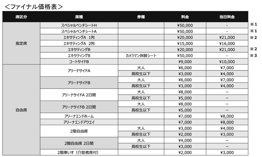 ・お付き添いの方はパイプ椅子でのご観戦となります。また同伴者が2名以上の場合は同様の席種をご購入ください。