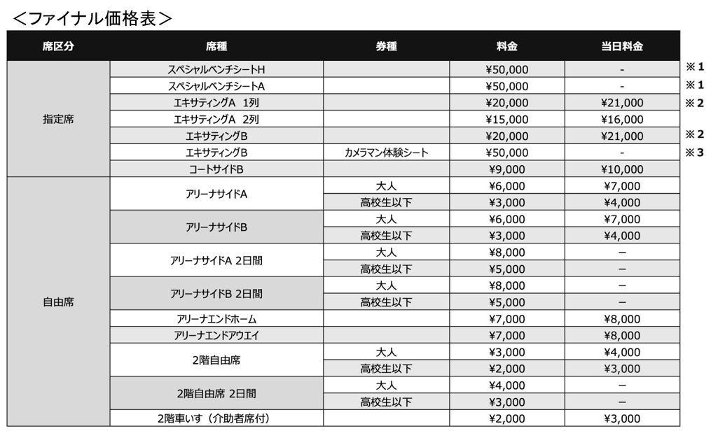 ・お付き添いの方はパイプ椅子でのご観戦となります。また同伴者が2名以上の場合は同様の席種をご購入ください。