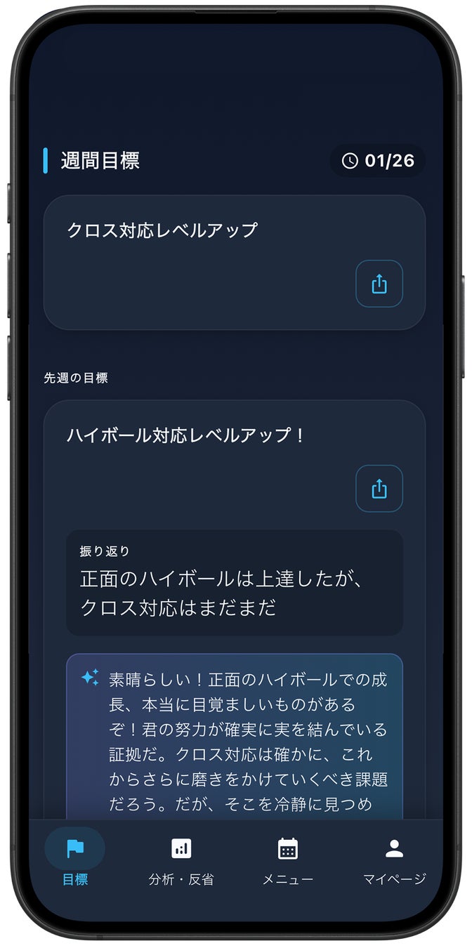 立てた練習メニューに対してAIからフィードバックを受けることも可能です。