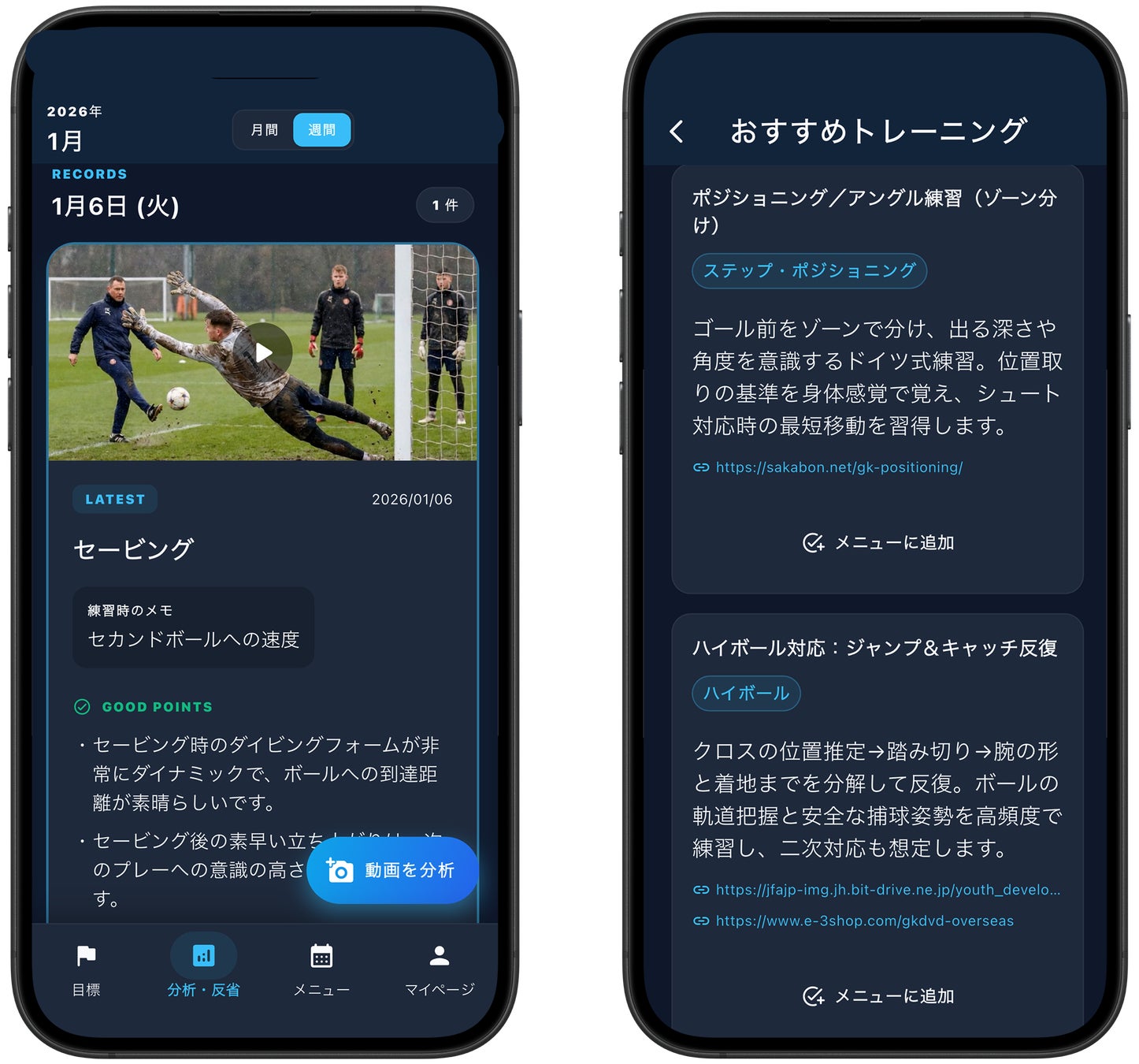 改善点やパーソナライズされた練習メニューを提案するアプリ『キーパーAIコーチ』をAppStore、GooglePlayの両アプリストアにリリースいたしました。