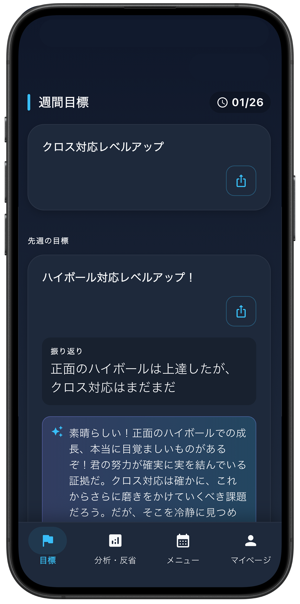 立てた練習メニューに対してAIからフィードバックを受けることも可能です。