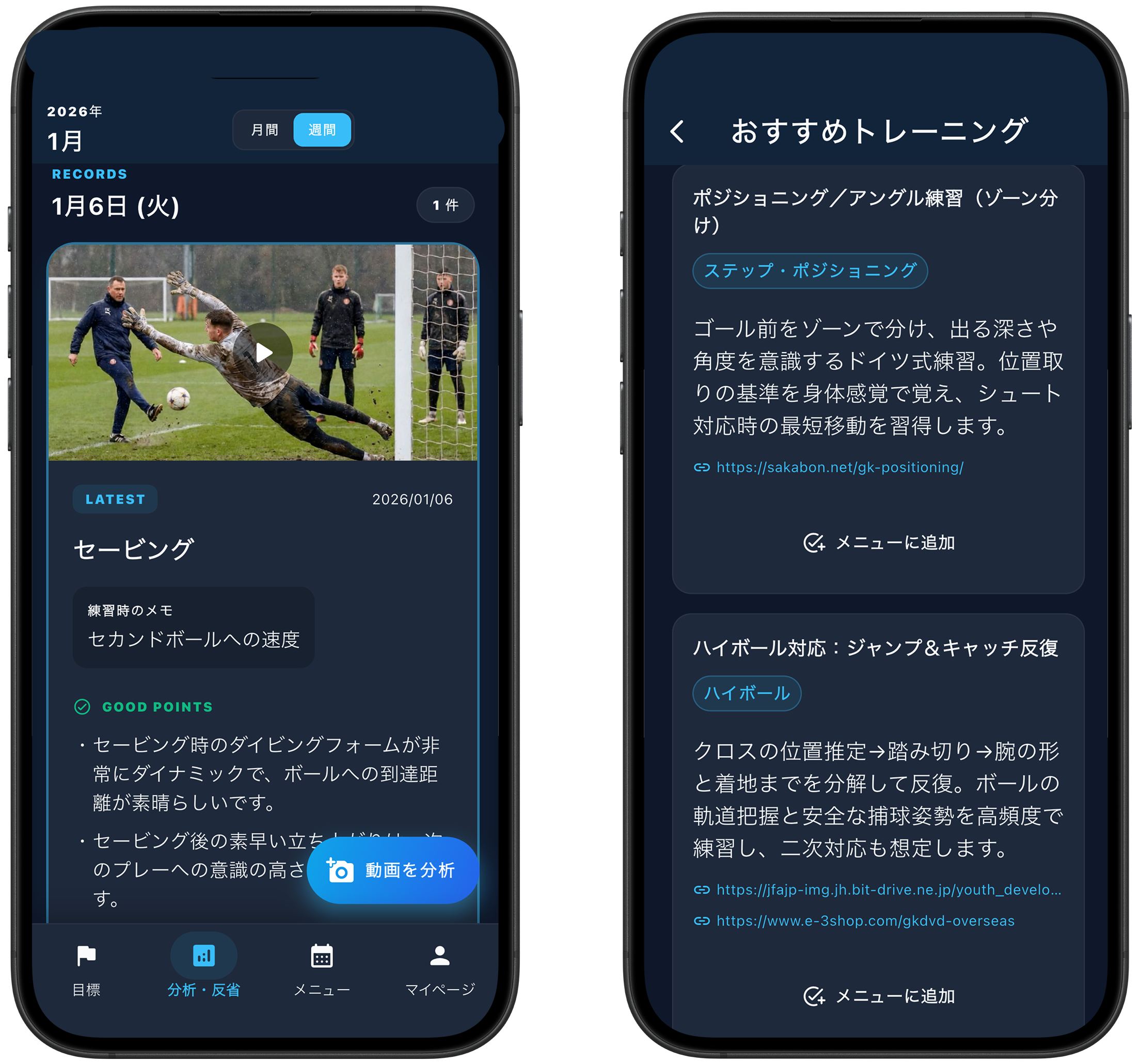 改善点やパーソナライズされた練習メニューを提案するアプリ『キーパーAIコーチ』をAppStore、GooglePlayの両アプリストアにリリースいたしました。