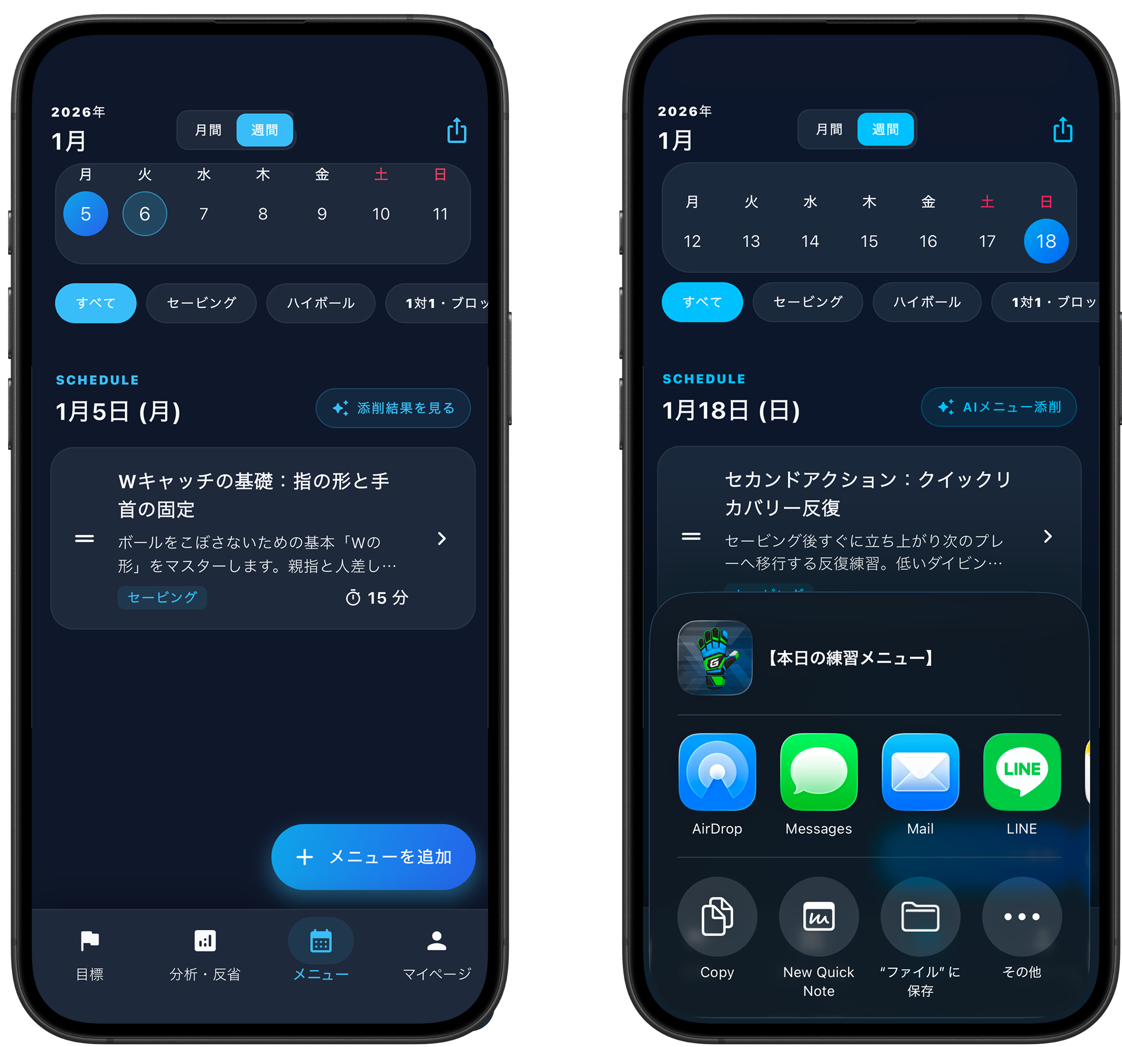 作成したメニューはLINE等で簡単にシェア可能なので、指導者による利用もおすすめです。