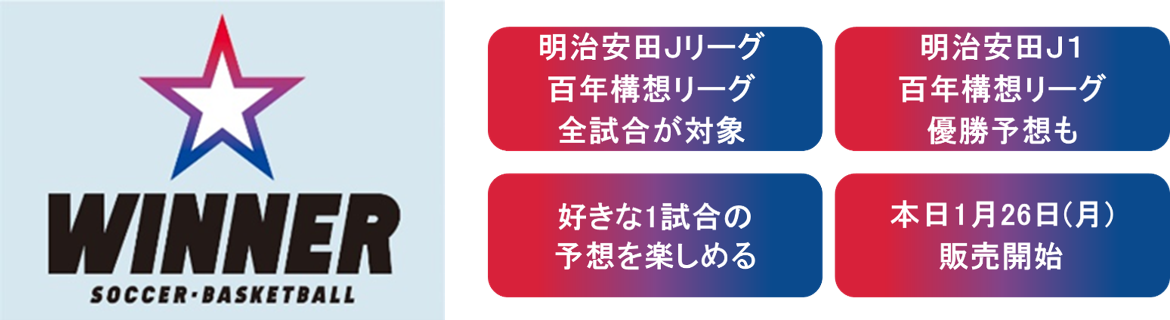 独立行政法人日本スポーツ振興センター(JSC)は、明治安田Jリーグ百年構想リーグの開幕に合わせて、Jリーグを対象とした1試合予想くじ「WINNER(ウィナー)」を、1月26日(月)から販売開始いたしました。