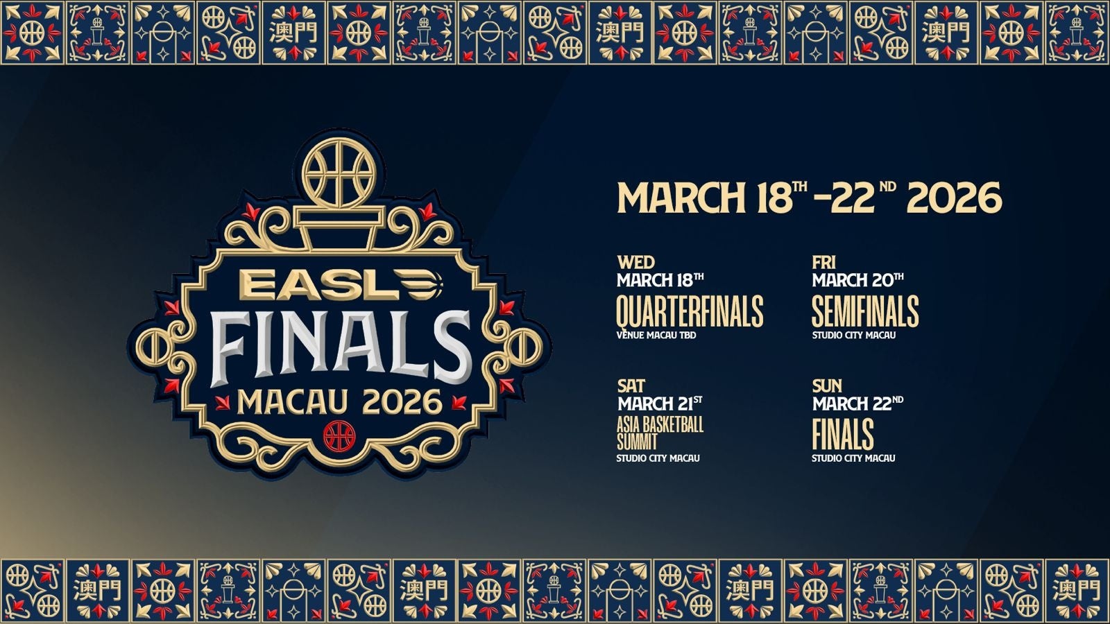 東アジアスーパーリーグ(以下、EASL)は、2026年3月18日(水)から22日(日)にかけて行われる2025-26シーズンのポストシーズン「EASLファイナルズ」を、マカオ特別行政区で開催することを正式に発表いたしました。本大会は、12チームによるグループステージを勝ち抜いた上位6チームが進出し、東アジア王者の座を懸けて戦います。
