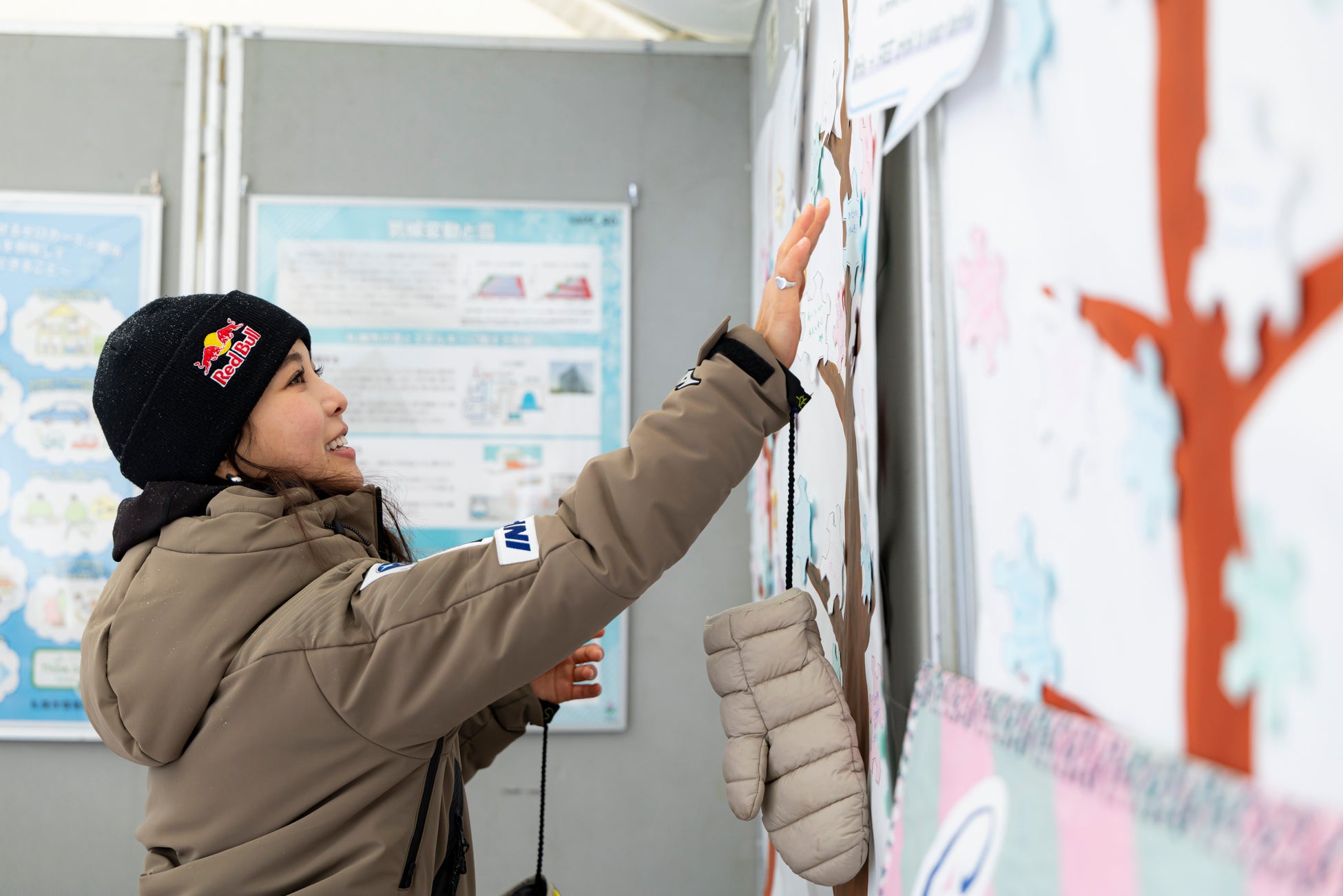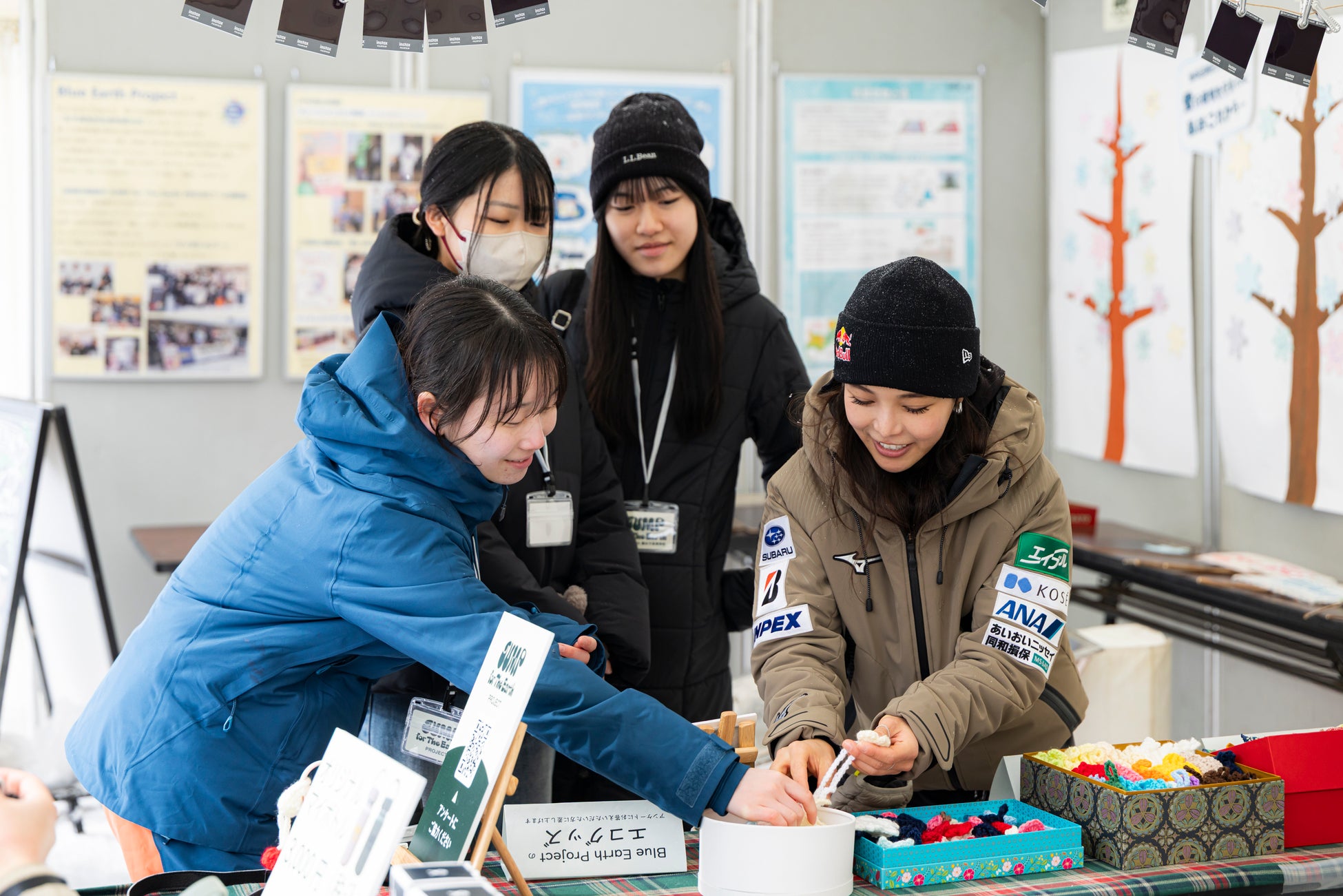 また、競技を終えた髙梨沙羅も「マイボトルバー」と「エコ活宣言ブース」に立ち寄り、多くの来場者が自らの言葉で綴った宣言に一つひとつ目を通しながら、その広がりに感心し、本活動を支えた藤女子高等学校の生徒たちへ感謝の言葉を伝えました。