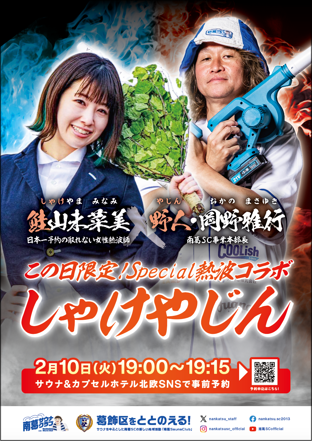 南葛SCは、「葛飾区をととのえる」を合言葉に、南葛SC現役選手が熱波師を務める地域施策「南葛サウナクラブ」の出張企画として、2026年2月10日(火)、サウナ&カプセルホテル北欧(東京都台東区上野)にて『南葛サウナクラブ出張熱波・第二弾 in サウナ北欧』を開催します。