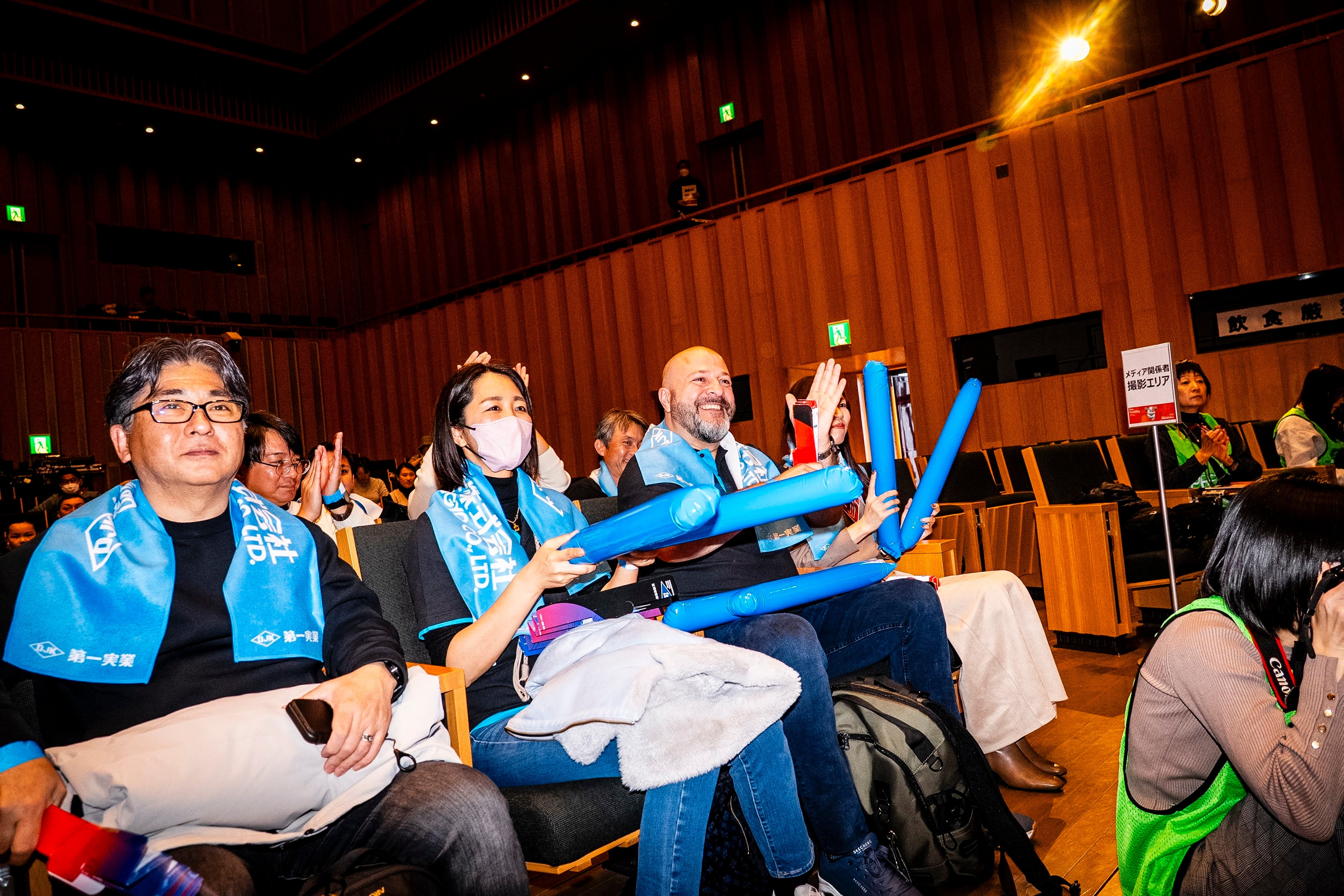 連盟オフィシャルパートナー(トップパートナー)である第一実業株式会社様からは、役員を含む社員とそのご家族合わせて約25名の応援団が来場。同社所属パラアスリート・石原正治選手の試技に対し、部署や役職の垣根を超えた大声援が送られました。表彰式後、バックボード前で行われた西井上席執行役員と石原選手の対談では、石原選手の「筋肉は 80 歳くらいまで育つんですよ」という言葉に、西井上席執行役員が身を乗り出して興味津々に耳を傾ける場面も。普段の業務とは異なる「アスリートとしての社員」の姿から経営層・同僚が日本記録へ本気の挑戦を目の当たりにし、世代や立場を超えて応援することで、組織のエンゲージメント向上と社内コミュニケーションの活性化に繋がりました。