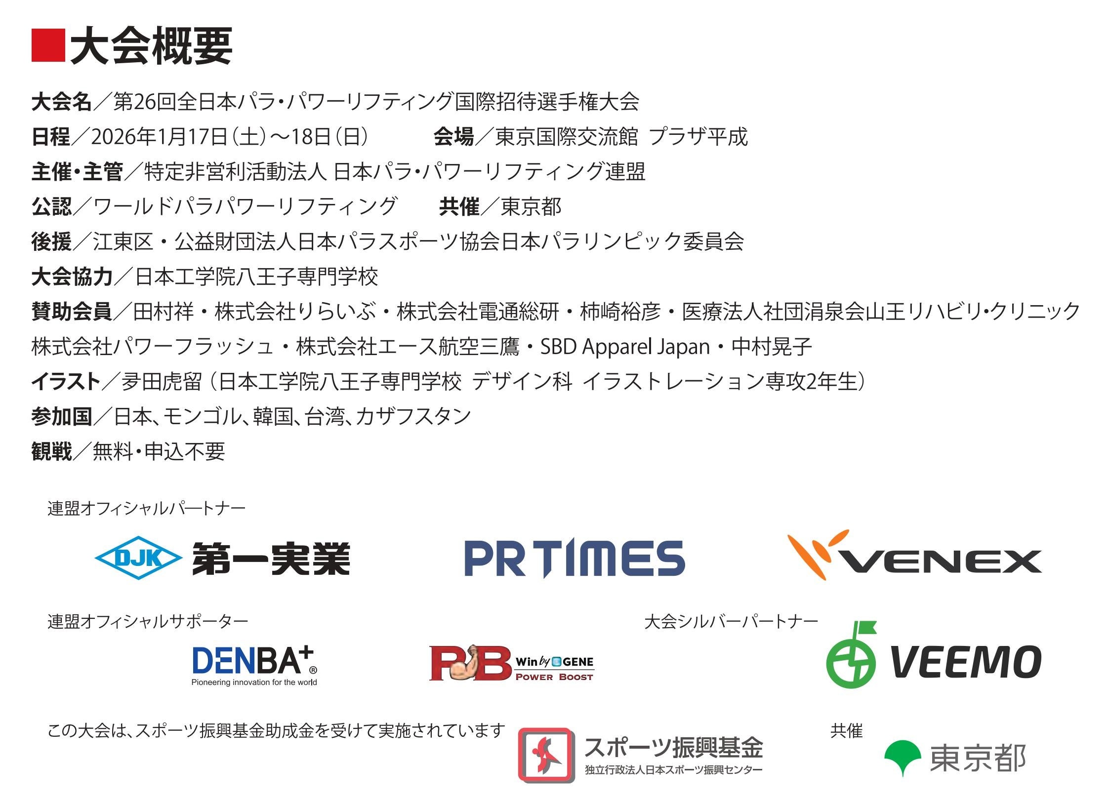 特定非営利活動法人日本パラ・パワーリフティング連盟(JPPF)は、2026年1月17日・18日に開催した「第26回全日本パラ・パワーリフティング国際招待選手権大会」において、複数の企業様と連携した新たな取り組みを実施いたしました。 本大会では、通年で連盟を支える「連盟協賛」企業との連携深化に加え、当連盟最高峰の「全日本選手権」としては創立以来初となる「大会単体への協賛(大会協賛)」企業も誕生しました。 各社がそれぞれの企業課題(組織活性化、理念浸透、マーケティング、CSR)を解決する「共創の場」としてパラスポーツを活用した、最新の連携事例をご報告します。