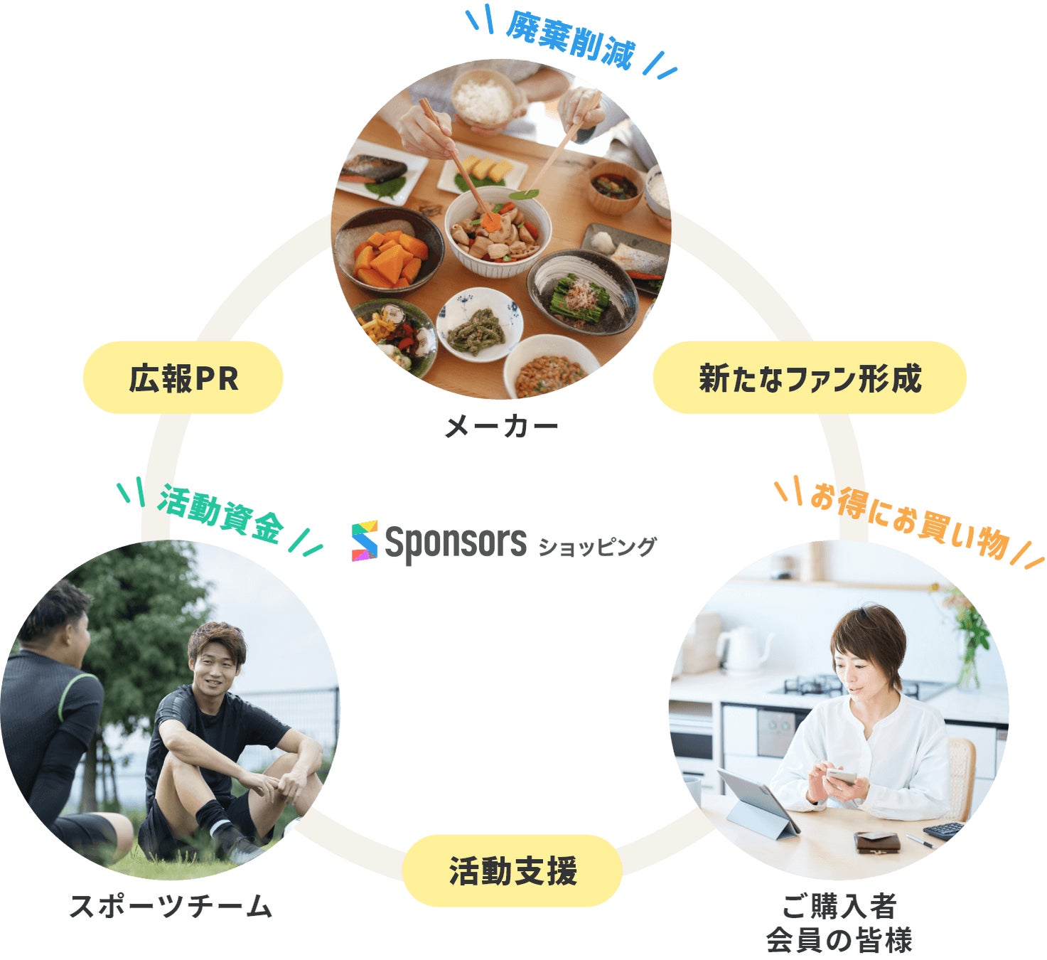 「Sponsors ショッピング」は、近年問題となっている「食品ロス:食べられるのに廃棄される食品」「衣服の廃棄:まだ使えるのに捨てられる日用品」などの問題を削減するため、商品をメーカー様から買い取りし、お手頃価格で皆様からご購入いただくことで、皆様と一緒に社会貢献活動への取り組むオンラインストアです。