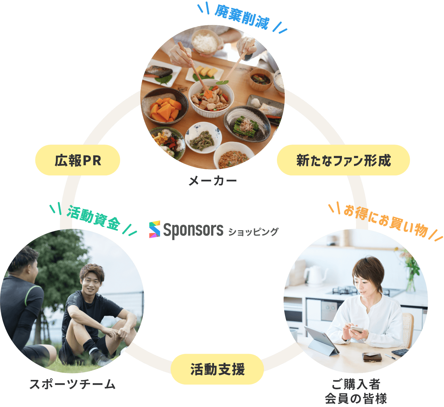 「Sponsors ショッピング」は、近年問題となっている「食品ロス:食べられるのに廃棄される食品」「衣服の廃棄:まだ使えるのに捨てられる日用品」などの問題を削減するため、商品をメーカー様から買い取りし、お手頃価格で皆様からご購入いただくことで、皆様と一緒に社会貢献活動への取り組むオンラインストアです。