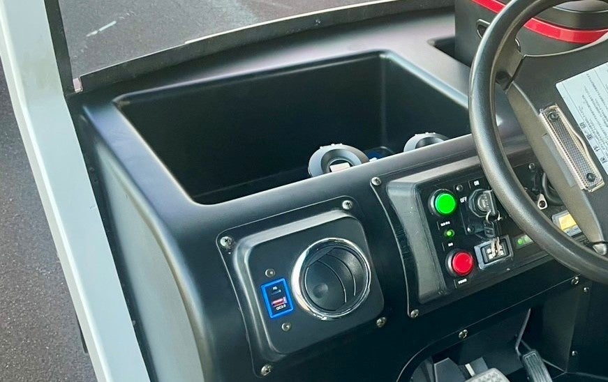また、カート車内のダッシュボードと一体化した電動温冷庫も備えており、夏場は冷たいドリンクを、冬場は温かいドリンクを楽しむことができます。電動温冷庫はマイナス20℃からプラス50℃の範囲で冷却・加温が可能です。車内にはUSBポートも搭載しているため、ラウンド中の携帯電話などの充電切れを防げます。