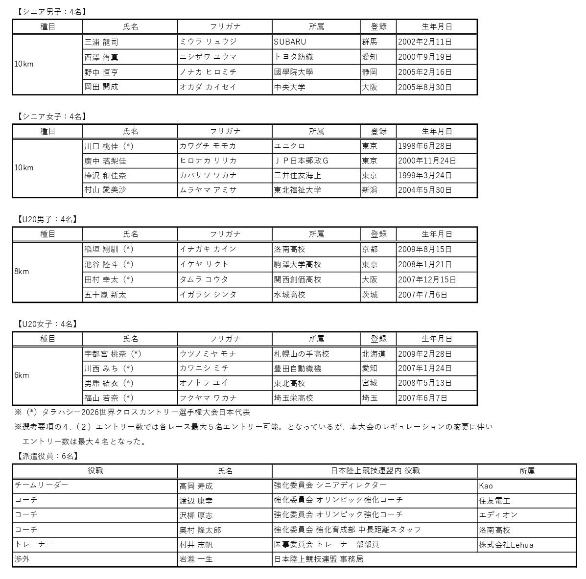 シニア日本代表には、東京2025世界陸上競技選手権大会で男子3000m障害物8位入賞の三浦龍司(SUBARU)、女子10000mで6位入賞の廣中璃梨佳(JP日本郵政G)を選出し、U20では男子に滋賀国民スポーツ大会少年B・3000m優勝の稲垣翔馴(洛南高校)、女子に第41回U20日本選手権3000m優勝の宇都宮桃奈(札幌山の手高校)をはじめ、計16名を日本代表選手として派遣いたします。