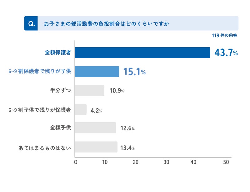 部活動費の負担割合を調査したところ、「全額保護者」が43.7%と最も多く、大学生になっても保護者が費用を全額負担しているケースが多いことがわかりました。「6〜9割が保護者で残りが子ども」(15.1%)を含めると、保護者が6割以上負担している家庭は58.8%に上ります。